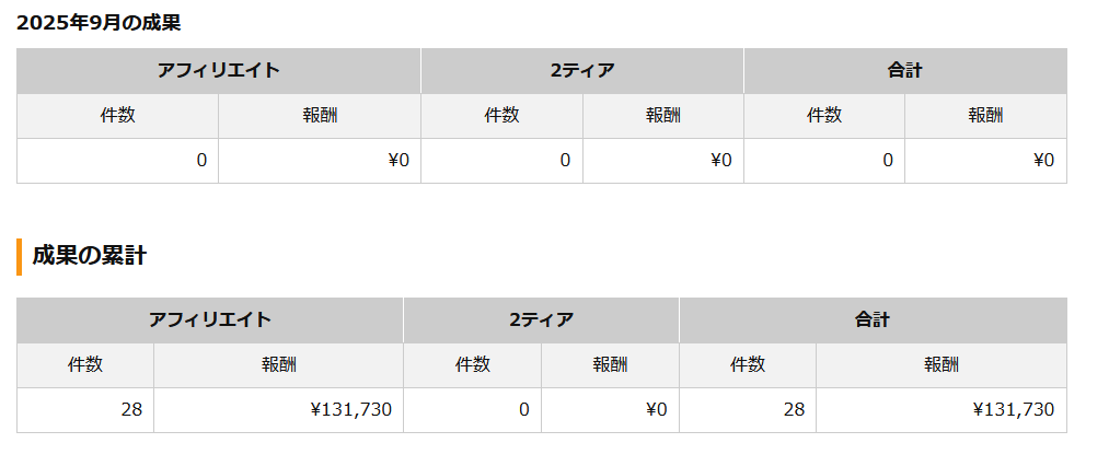 過去に情報商材アフィリエイトで 28件・報酬合計 ¥131,730 の成果を達成しました。